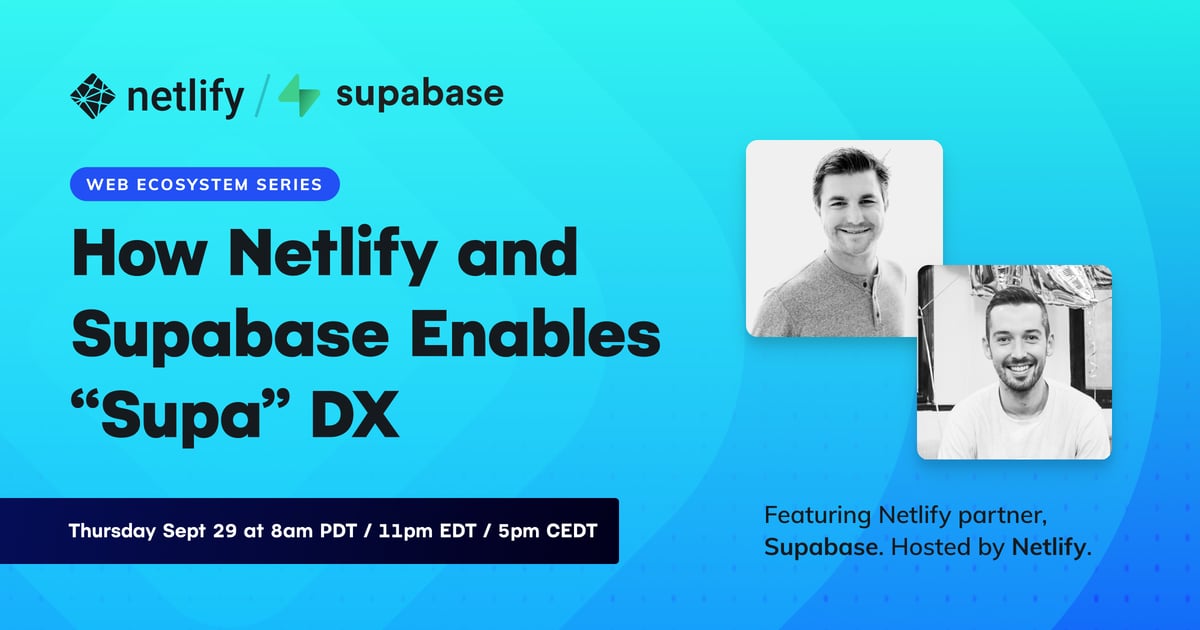 In this partner webinar with Supabase's Co-Founder and CTO, Ant Wilson, and Netlify's VP of Partnerships & Ecosystems, Steven Larsen, they'll show you how to: